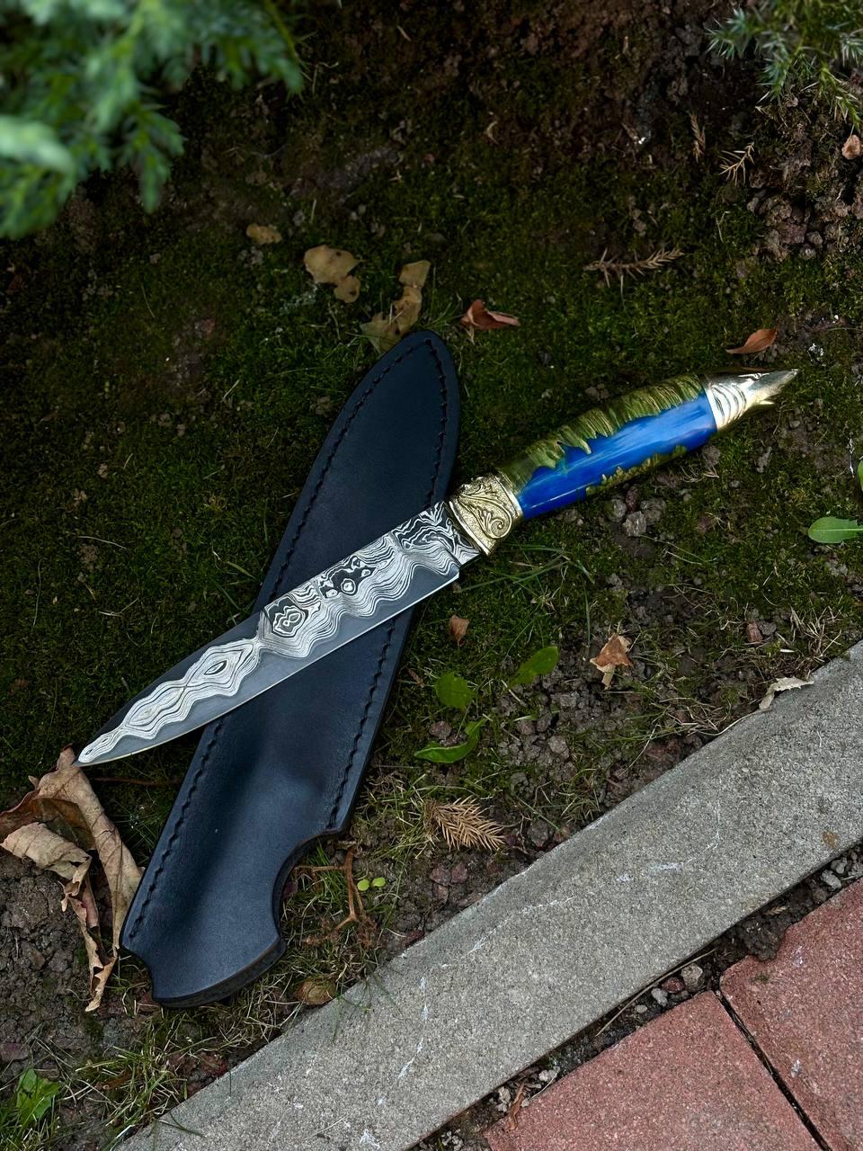 Ніж ручної роботи із ламінованого дамаска «Акула #3» зі шкіряними піхвами, 60-61 HRC.
